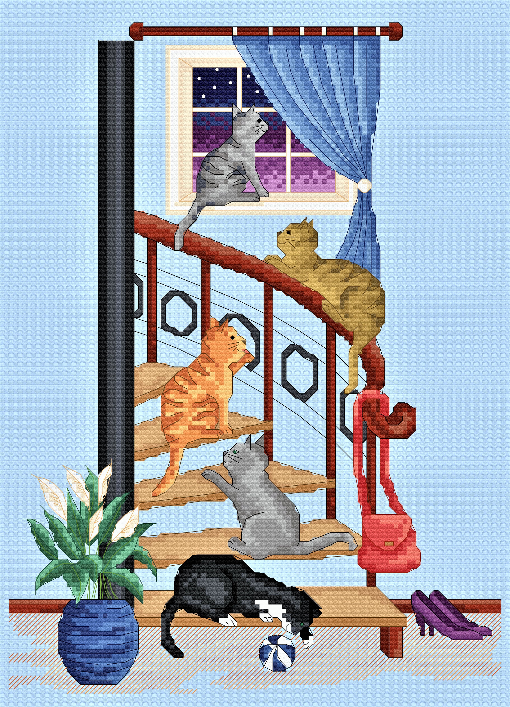 Cross Stitch Cats On A Spiral Staircase Chart Pdf Pattern Etsy